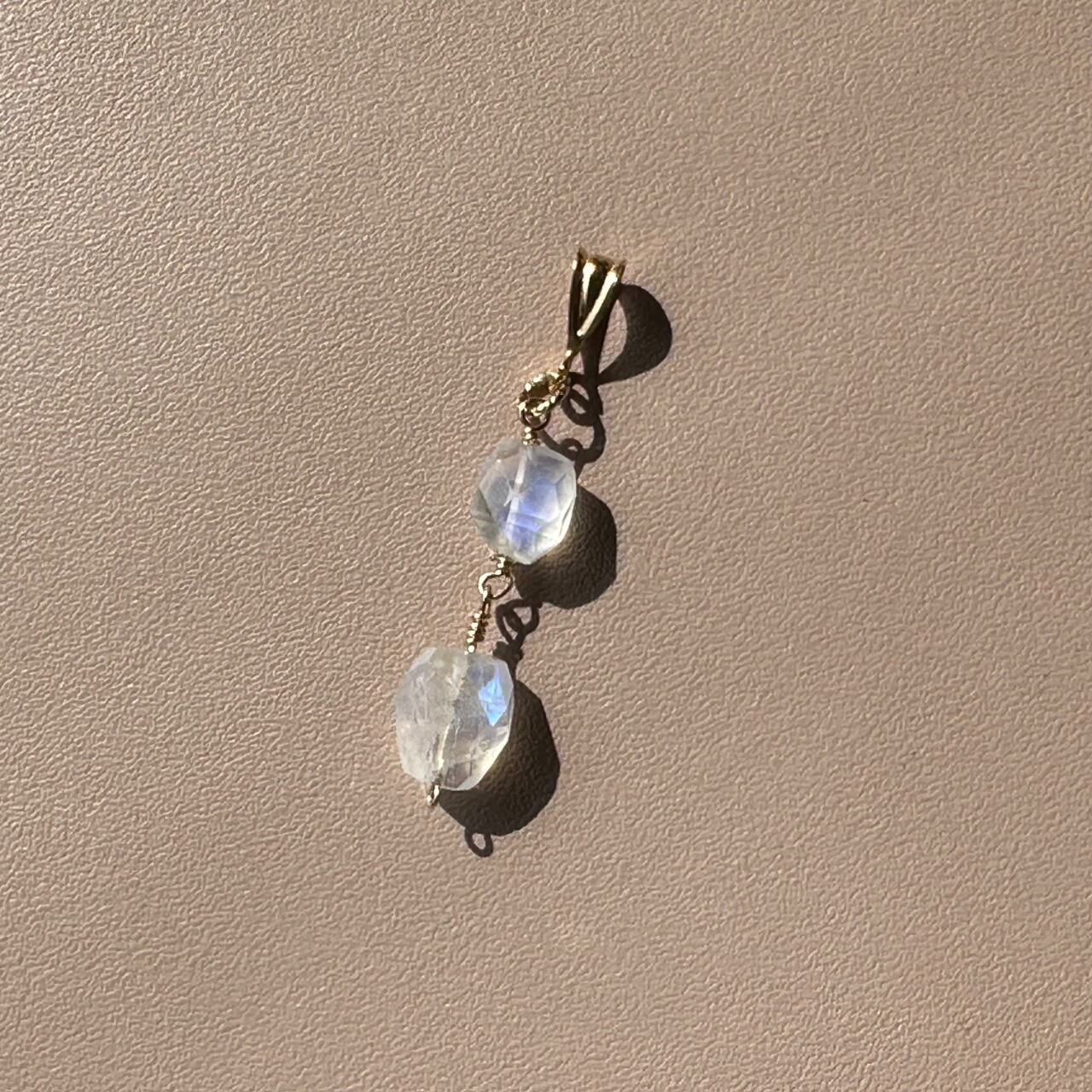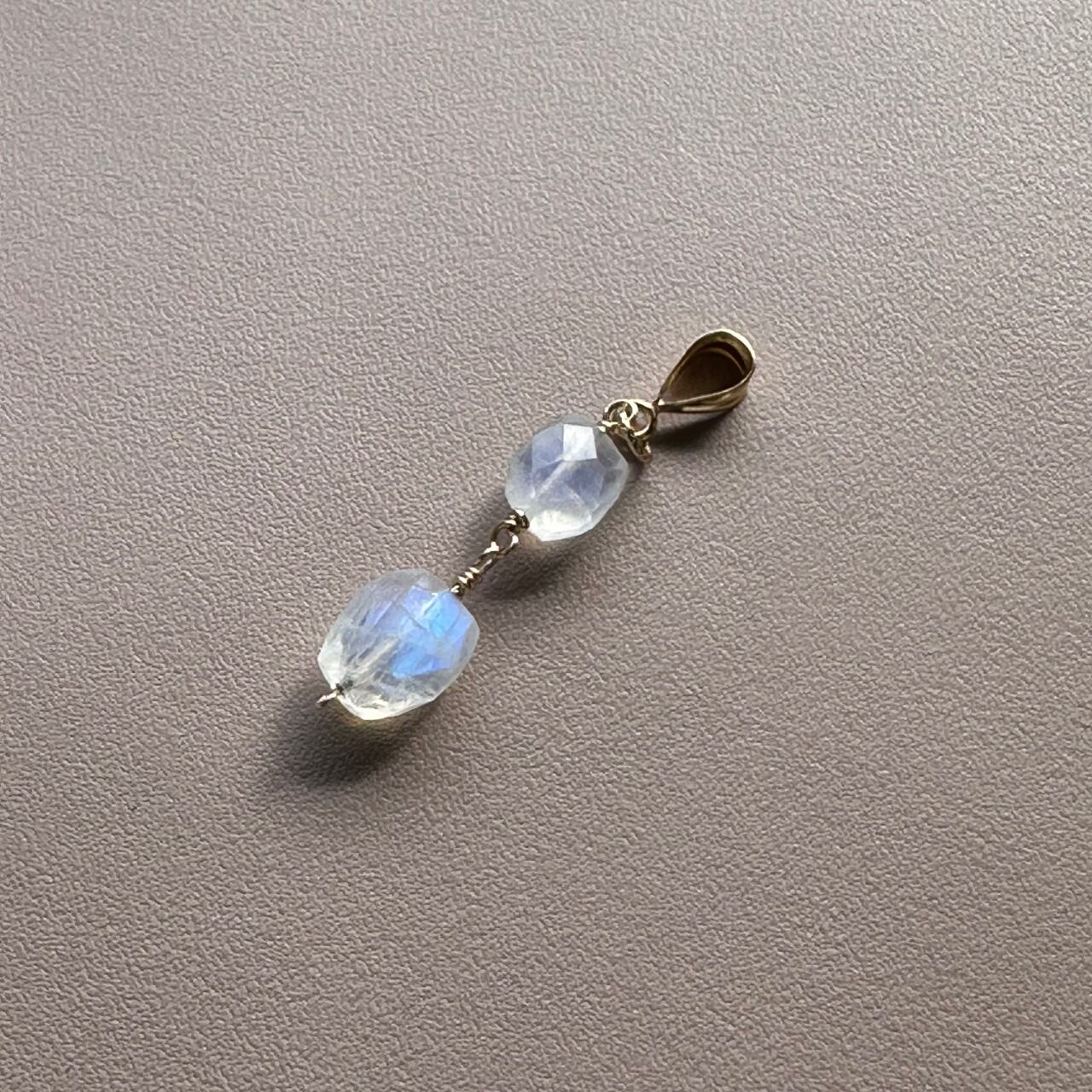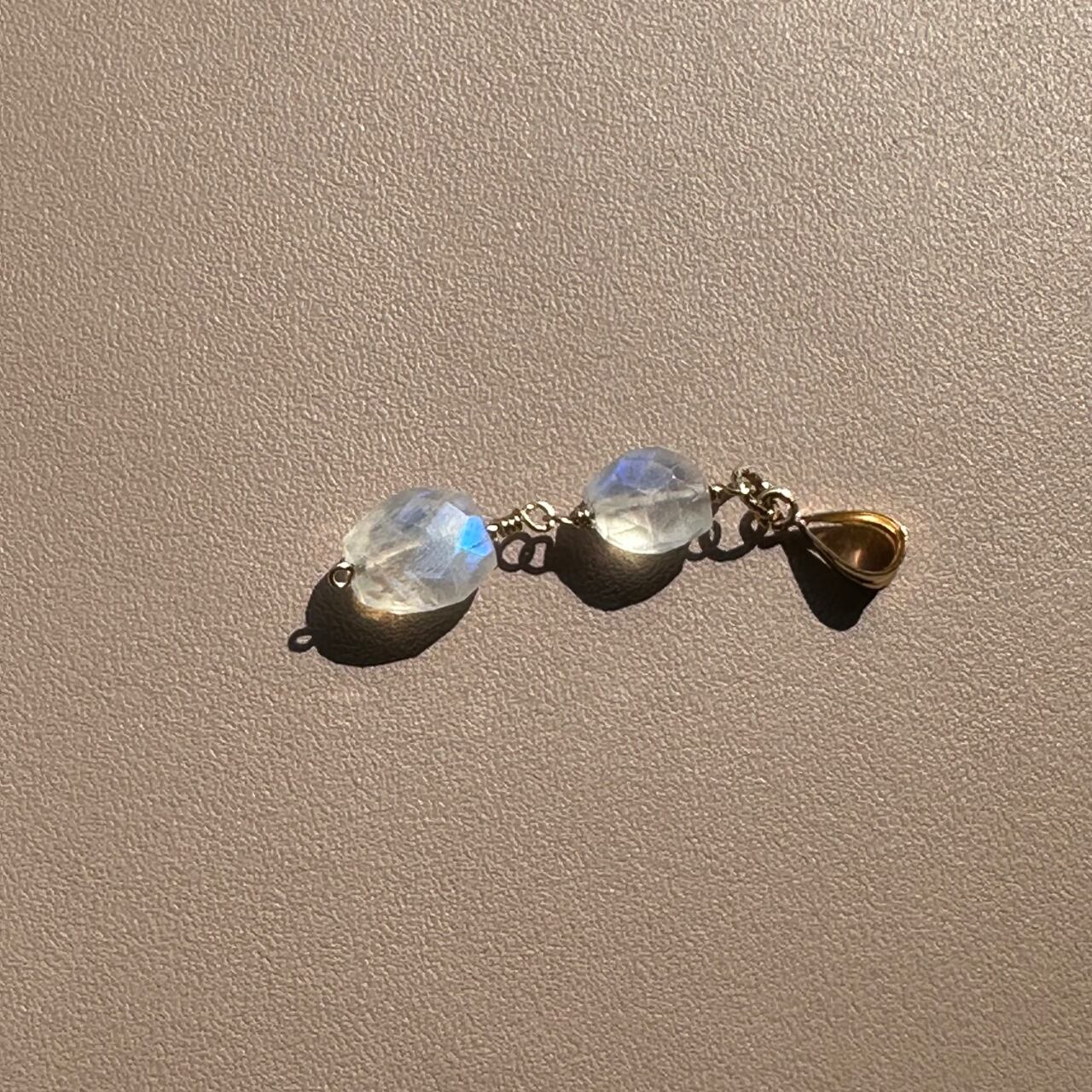 こちらのアクセサリーは、透明感あふれるホワイトラブラドライトを二石つなげた、シンプルで上品なペンダントトップ。