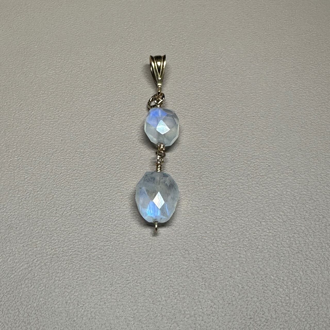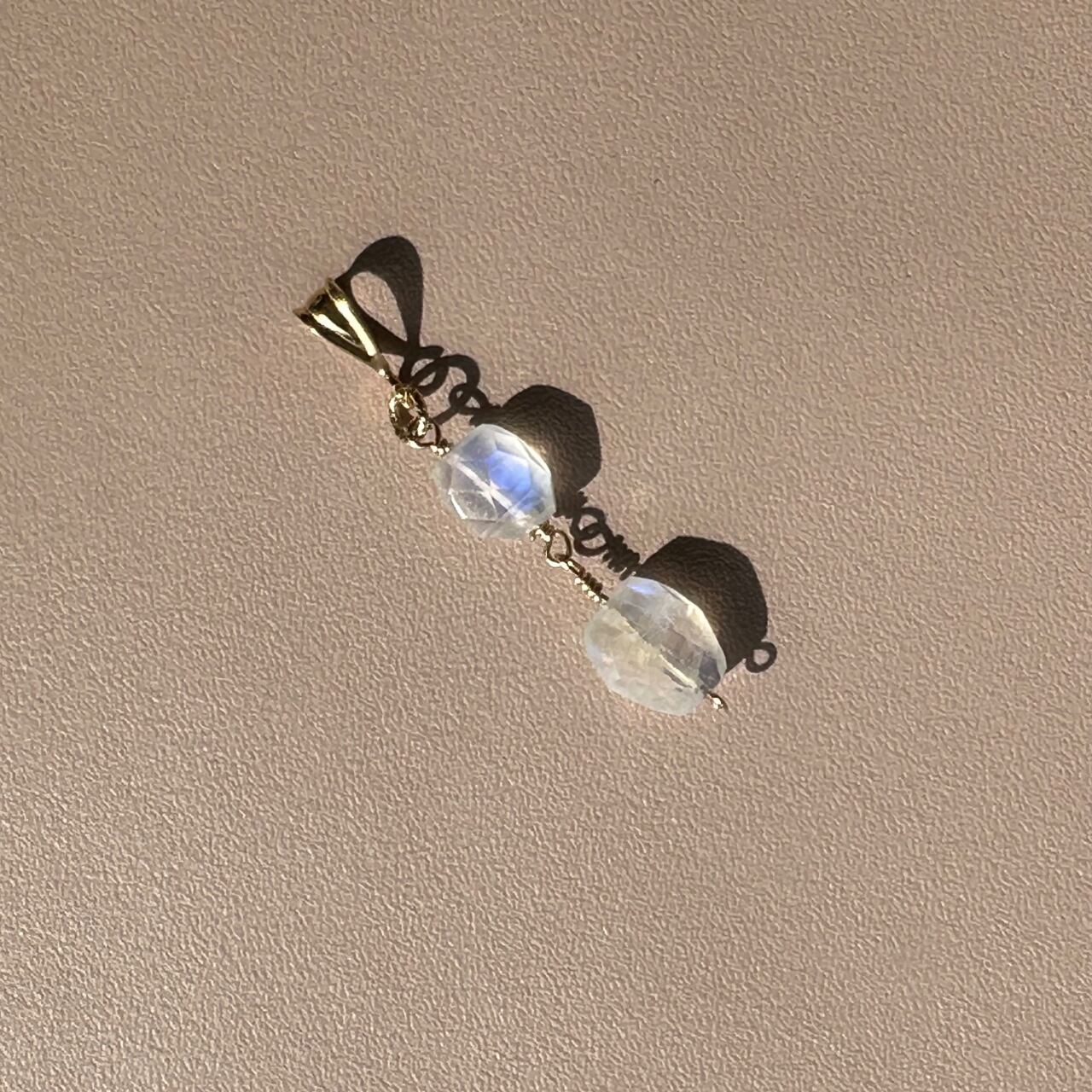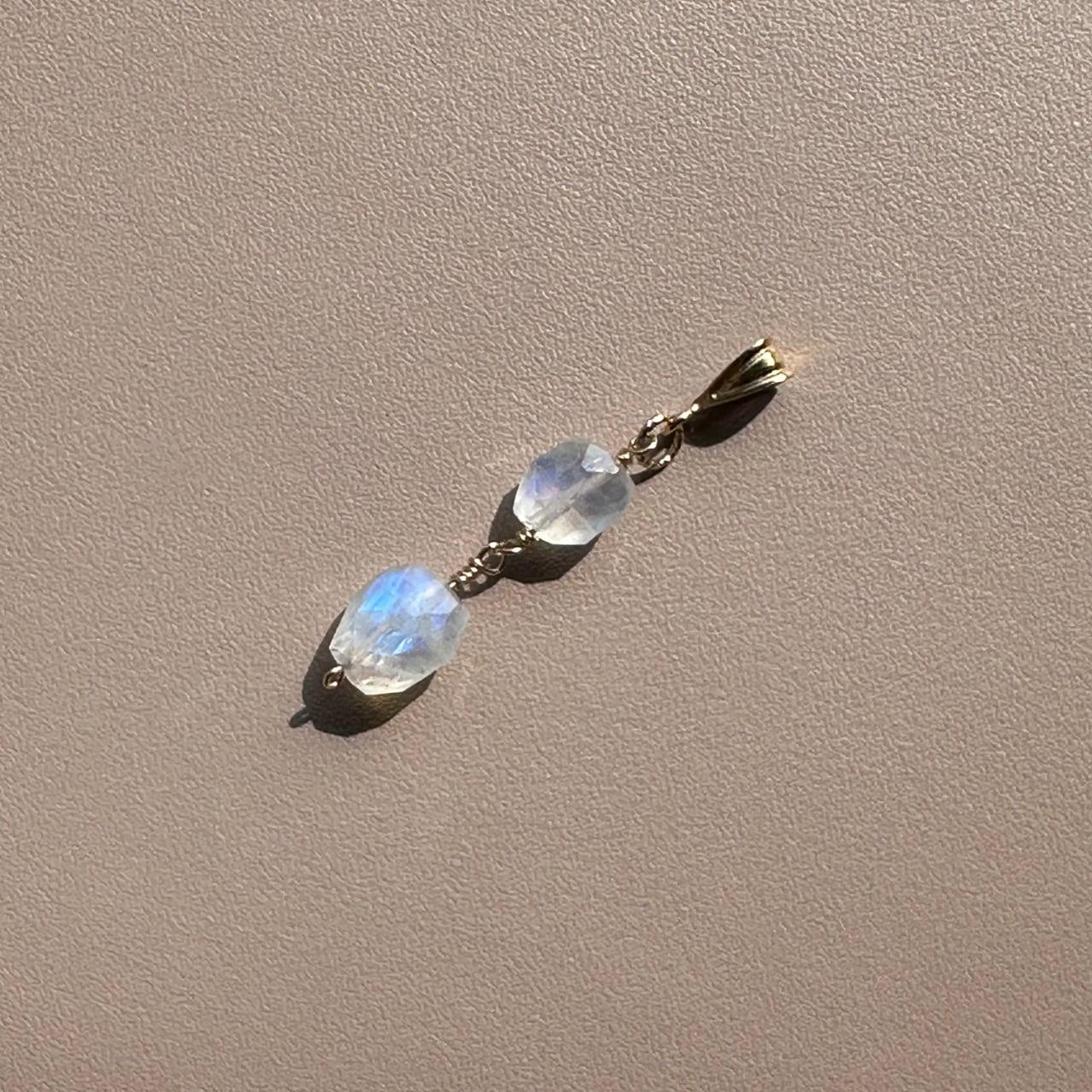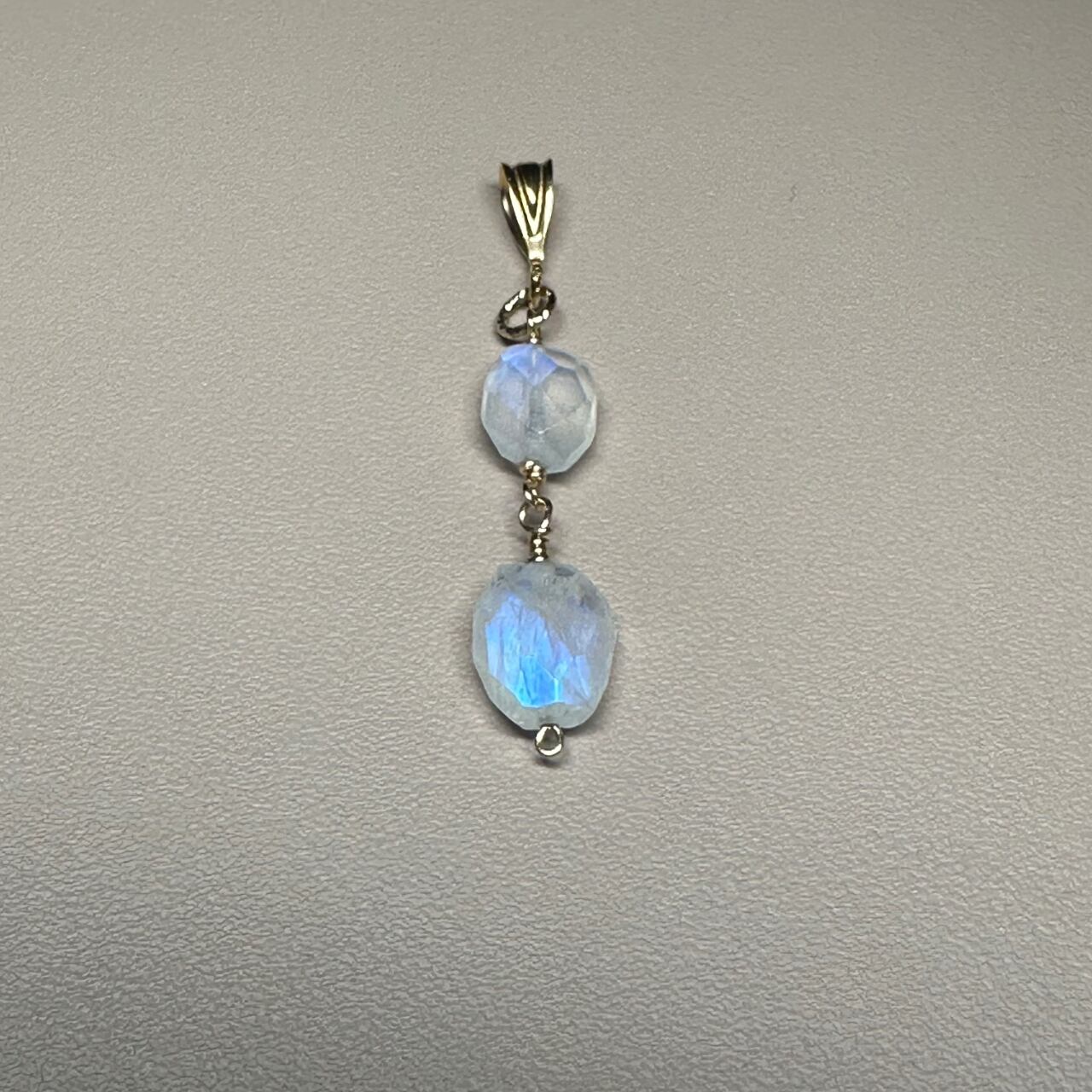こちらのアクセサリーは、透明感あふれるホワイトラブラドライトを二石つなげた、シンプルで上品なペンダントトップ。